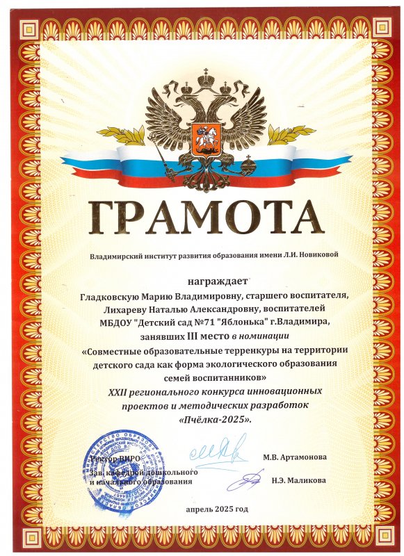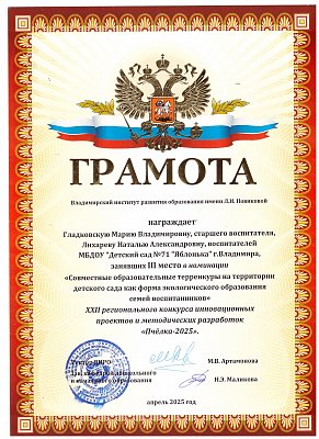 Грамота за III место XXII регионального конкурса инновационных проектов и методических разработок "Пчелка 2025"